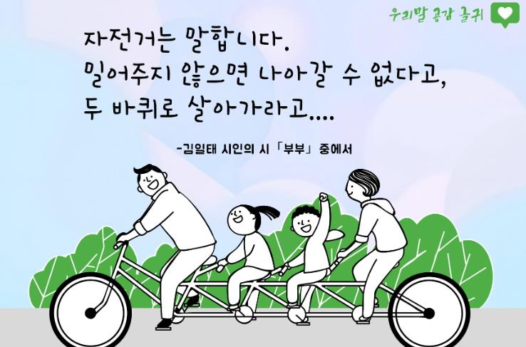 창원특례시는 8월의 ‘우리말 공감 글귀’로 김일태 시인의 시 ‘부부’의 한 구절인 “자전거는 말합니다. 밀어주지 않으면 나아갈 수 없다고, 두 바퀴로 살아가라고....”를 선정했다고 31일 밝혔다.
