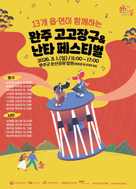 [뉴스노크=김인호 기자] 완주문화재단은 오는 3월 1일 완주군 둔산공원 일원에서 13개 읍·면이 2026 완주 고고장구·난타 페스티벌을 개최한다.