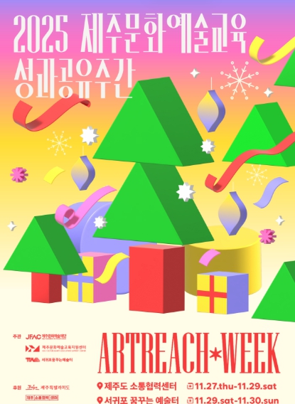 [뉴스노크=김인호 기자] 제주문화예술재단은 오는 27일부터 30일까지 4일간 제주도 소통협력센터(제주시 관덕로 44)와 서귀포 꿈꾸는 예술터(서귀포시 천제연로 164)에서 2025년 제주문화예술교육 성과를 도민에게 공유하는 문화예술교육 축제인 '아트리치위크'를 운영한다.