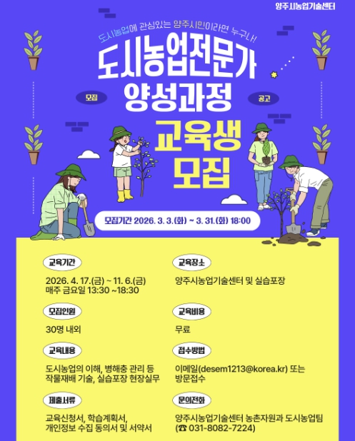 [뉴스노크=김인호 기자] 양주시는 도시농업 활성화와 전문인력 양성을 위해 오는 3월 31일까지 ‘2026년 도시농업전문가 양성과정’ 제8기 교육생을 모집한다.