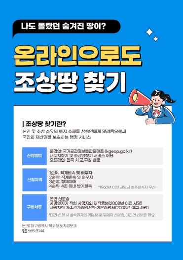 [뉴스노크=김인호 기자] 대구 북구청은 시민들의 재산권 보호와 토지 재산 관리 편의 제공을 위해 ‘조상땅 찾기’서비스를 상시 운영 중이라고 밝혔다.