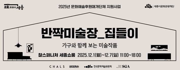 [뉴스노크=김인호 기자] 세종시문화관광재단(대표이사 박영국)은 세종화랑협회, (주)찰스와 함께 만드는 협업 전시 ‘반짝 미술장_집들이’를 12월 1일부터 7일까지 찰스퍼니처 세종 쇼룸에서 개최한다고 밝혔다. 이번 전시는 ‘집’을 주제로 한 공간형 전시이자, 지역 시각예술을 생활공간 속에서 자연스럽게 경험하도록 기획된 미술시장형 프로그램이다.