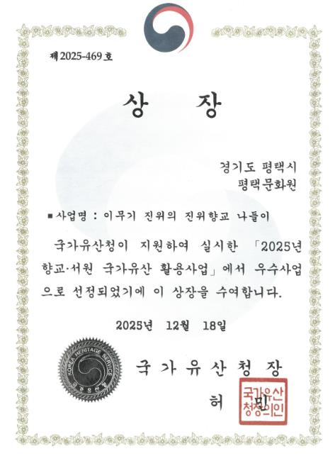 오중근 평택문화원장은 “이번 우수사업 수상은 지역 국가유산의 가치를 시민과 함께 나누고자 한 꾸준한 노력의 성과”라며, “앞으로도 진위향교를 비롯한 평택의 국가유산을 활용해 세대를 연결하고 지역의 이야기를 확장하는 프로그램을 지속적으로 발굴·운영해 나가겠다”고 밝혔다.