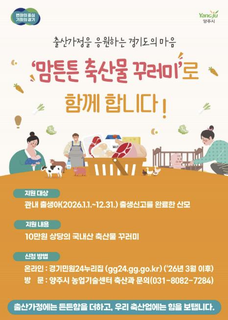 [뉴스노크=김인호 기자] 양주시는 출산 가정의 건강 증진과 지역 축산물 소비 촉진을 위해 ‘2026년 맘튼튼 축산물 꾸러미 지원사업'을 추진한다.