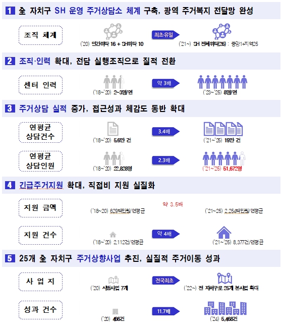 비닐하우스를 비롯한 쪽방·고시원 등 취약한 환경에서 거주 중인 시민에게 임대주택을 제공하는 ‘주거상향사업’은 2020년 7개 자치구 시범사업을 시작으로 2022년부터 전체 자치구에서 확대 운영 중이다. 지원 규모는 2020년 466건에서 2025년 5,418건으로 11배가량 늘어 시민들의 주거안전과 주거 질 개선에 기여했다는 평가다.