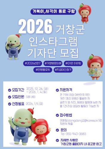 [뉴스노크=김인호 기자] 거창군은 지역 관광자원의 매력을 생생하게 전달하고 온라인 홍보를 강화하기 위해 ‘2026년 거창군 인스타그램 기자단’을 모집한다고 26일 밝혔다.