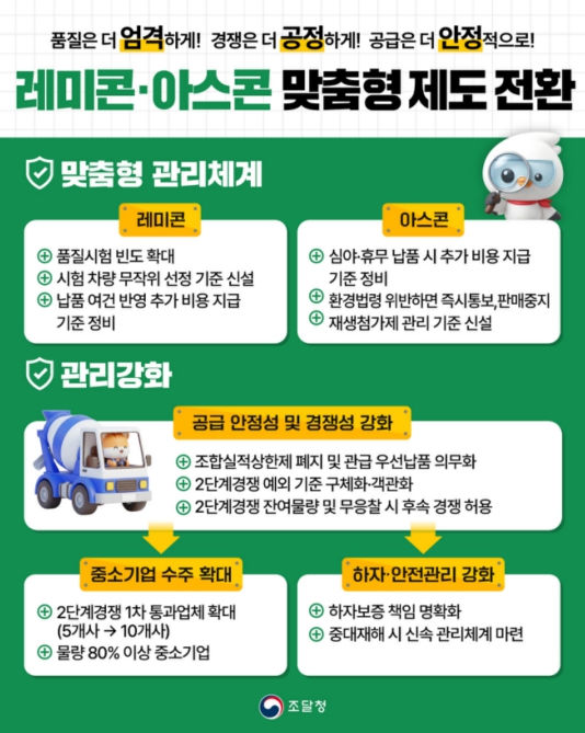 [뉴스노크=김인호 기자] 조달청은 레미콘·아스콘의 물품 특성을 반영한 맞춤형 제도 운영을 위해 관련 규정을 전면 개정하고 2026년 3월 1일부터 시행한다고 밝혔다.
