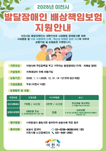 [뉴스노크=김인호 기자] 이천시는 2026년 1월 1일부터 경기도 최초로 발달장애인을 위한 배상책임보험 가입 지원을 시행한다고 밝혔다.