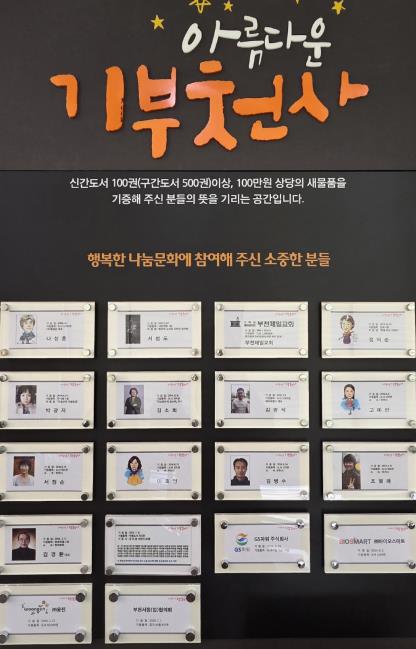 ‘아름다운 기부천사’ 게시판은 상동도서관 1층 로비에 마련돼 시민 누구나 쉽게 볼 수 있도록 조성돼 있다. 특히, 책을 통한 나눔의 가치를 전하고 자발적인 기부 문화를 확산하는 상징적 공간으로 자리매김하고 있다.