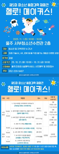울주 서부청소년수련관 강미선 관장은“청소년은 물론 가족 단위 참가자들에게도 유익한 4차 산업 기술 체험과 창의적인 활동 기회를 제공할 것”이라며,“다가오는 미래를 직접 보고, 만들고, 경험해볼 수 있는 뜻깊은 자리가 될 것으로 기대된다”고 전했다.