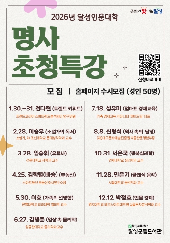 [뉴스노크=김인호 기자] 대구 달성군립도서관은 2026년 한 해 동안 지역 주민들을 위한 ‘명사초청특강’을 진행한다고 8일 밝혔다.