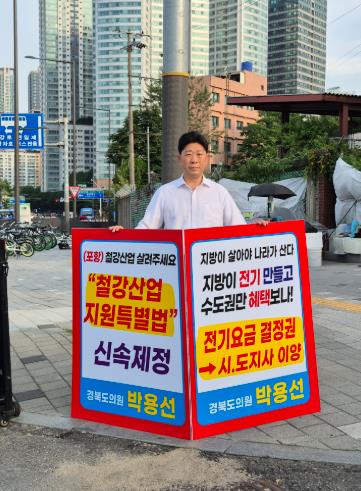 [뉴스노크=김인호 기자] 박용선 경상북도의회 의원은 1일 오전, 용산 대통령실 앞에서 산업용 전기요금 반값 인하를 강력히 촉구하는 1인 시위에 나섰다.