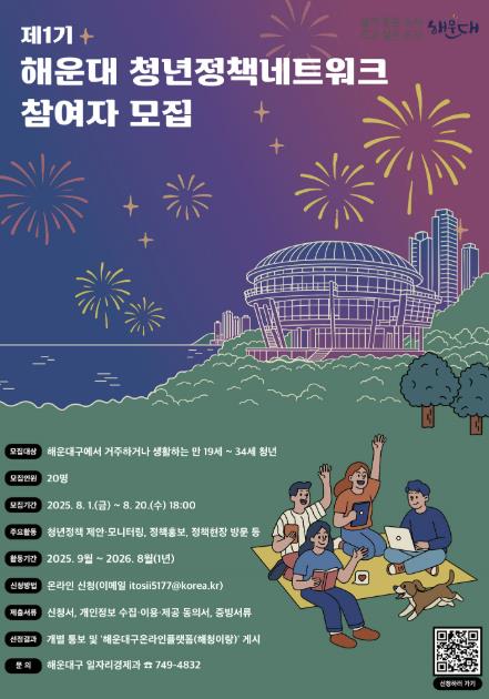 [뉴스노크=김인호 기자] 해운대구는 청년의 정책 참여를 확대하고, 청년의 시선에서 지역 현안을 바라보며 실질적인 변화를 이끌어갈 ‘제1기 해운대청년정책네트워크(해청넷)’의 참여자를 8월 20일까지 모집한다.