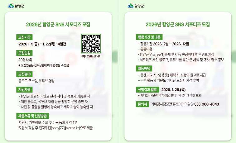 [뉴스노크=김인호 기자] 함양군은 군민의 눈높이에서 소통하며 군의 생생한 현장 소식을 전달할 ‘2026년 함양군 누리소통망(SNS) 서포터즈’를 모집한다고 밝혔다.