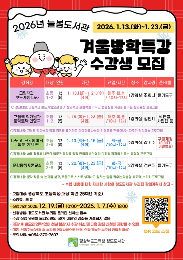 [뉴스노크=김인호 기자] 경상북도교육청 청도도서관(관장 조은희)은 겨울방학을 맞아 어린이들의 창의력과 사고력을 키울 수 있는 '2026년 늘봄도서관 겨울방학특강' 수강생을 오는 12월 19일부터 모집한다.