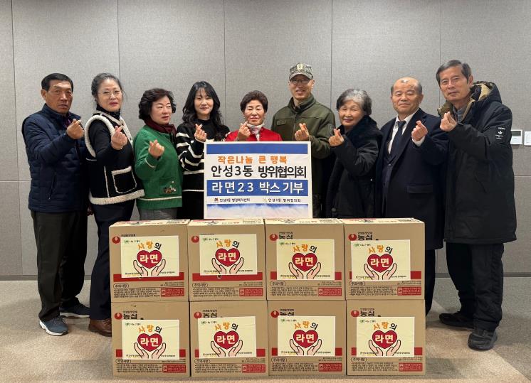 [뉴스노크=김인호 기자] 안성시 안성3동 방위협의회는 지난 8일 사랑의 라면(23박스) 기탁행사를 진행하며 지역사회에 훈훈한 감동을 전했다.