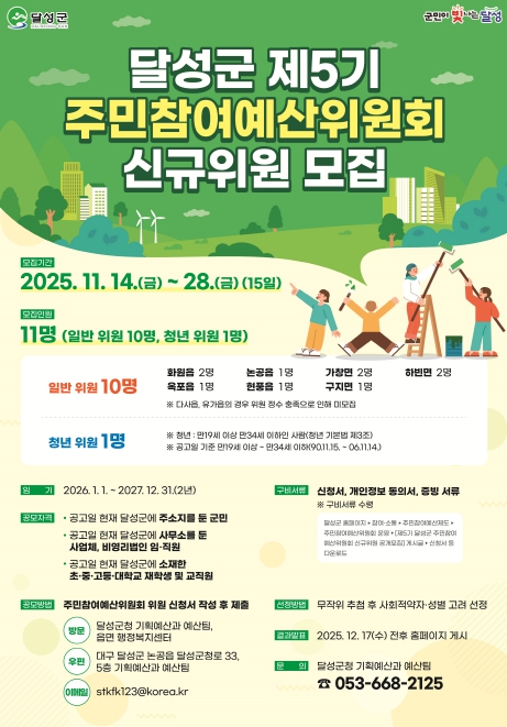 [뉴스노크=김인호 기자] 달성군은 11월 14일부터 28일까지 제5기 주민참여예산위원회 신규위원 11명을 모집한다.