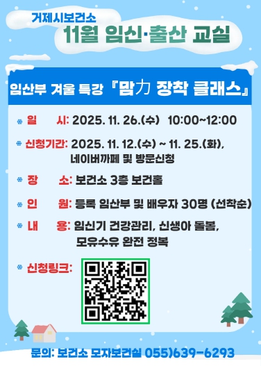 [뉴스노크=김인호 기자] 거제시보건소는 오는 11월 26일 오전 10시부터 12시까지 보건소 3층 보건홀에서 '맘力 장착 클래스' 겨울 특강을 개최한다. 지역 내 임산부와 배우자를 대상으로 하며, 11월 12일부터 네이버 카페 또는 모자보건실 방문을 통해 신청할 수 있다.