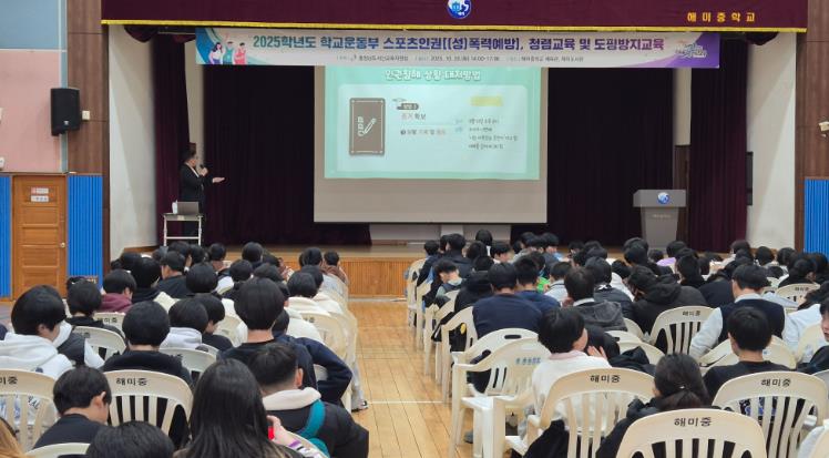 [뉴스노크=김인호 기자] 충청남도서산교육지원청은 지난 28일, 해미중학교 체육관과 해미도서관에서 학생선수, 운동부 지도교사, 운동부 지도자, 전문스포츠지도자를 대상으로 한 '2025학년도 학교운동부 스포츠인권((성)폭력예방), 청렴교육 및 도핑방지교육'을 실시했다.