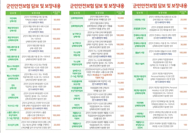 군민안전보험의 주요항목으로는 ▲익사사고 사망 ▲폭발화재붕괴 상해사망 ▲농기계 사고 ▲개물림사고 응급실 내원 치료비 등 실생활과 밀접한 재난·사고가 포함되며, 인적피해 발생 시 최소 10만원에서 1억원까지 보장이 가능하다. 특히, 1억원 한도 보장 항목이 10개에 달해 전국 최고 수준의 보장체계를 갖추고 있다. 다만, 타 지자체로 전출, 만 15세 미만자의 사망은 보장에서 제외된다.