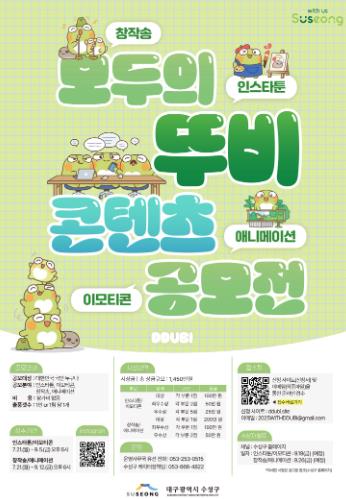 김대권 수성구청장은 “뚜비는 수성구의 가치를 담은 캐릭터이자, 모두와 함께 웃고 소통하는 캐릭터로 성장 중”이라며 “재미있고, 창의력 넘치는 콘텐츠로 뚜비와 함께할 시민들의 많은 관심과 참여를 바라며 이번 공모전을 통해 뚜비의 세계관이 시민의 손으로 재해석되고 확장되기를 기대한다”고 밝혔다.