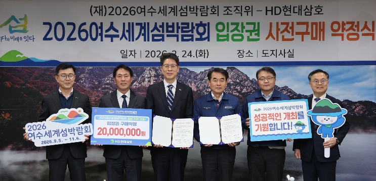 [뉴스노크=김인호 기자] (재)2026여수세계섬박람회조직위원회는 2월 24일 전라남도청 도지사실에서 HD현대삼호와 ‘2026여수세계섬박람회 입장권 구매약정식’을 개최했다고 밝혔다.
