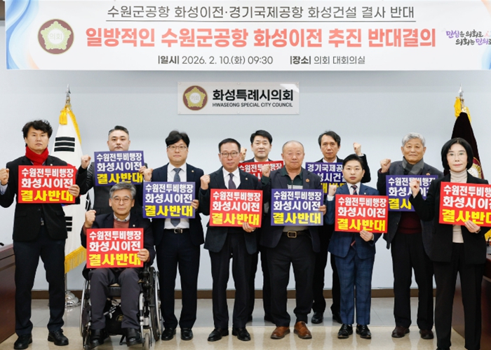 한편, 수원 군공항 화성시 이전 반대 특별위원회는 공동위원장 정흥범·김영수 의원을 비롯해 김경희·김상균·김상수·김종복·배정수·송선영·이계철·이용운·이은진·전성균·조오순·차순임·최은희 의원 등 총 15명으로 구성되어 있으며, 수원 군공항 화성시 이전 저지를 위해 2026년 6월까지 지속적인 결의 및 대응 활동을 이어갈 계획이다.