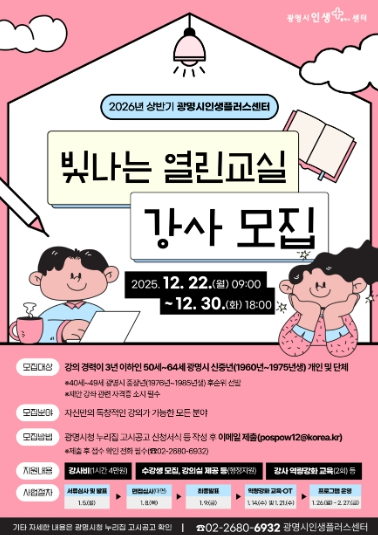 서류심사와 면접을 통해 선발된 강사는 2026년 1월 26일부터 2월 27일까지 자신의 전문 분야를 바탕으로 제안한 강좌를 광명시인생플러스센터에서 총 4회 진행하게 된다. 강의료는 시간당 4만 원 수준이다.