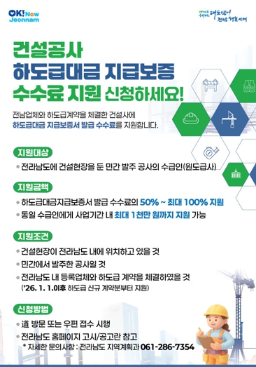 [뉴스노크=김인호 기자] 전라남도가 건설산업 활력을 높이고 하도급 업체 보호를 위해 ‘2026년 건설공사 하도급대금 지급보증 수수료 지원사업’을 확대 추진한다.