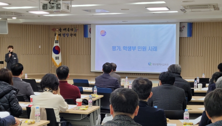 [뉴스노크=김인호 기자] 대구시교육청은 12월 22일 오후 2시부터 동관 7층 대회의실에서 사립 학교의 학사 운영 전반에 대한 이해를 돕고, 안정적이고 책임 있는 학교 운영을 지원하기 위해 사립 고등학교장 49명을 대상으로 ‘학사운영 역량 강화 전달 연수’를 실시한다.
