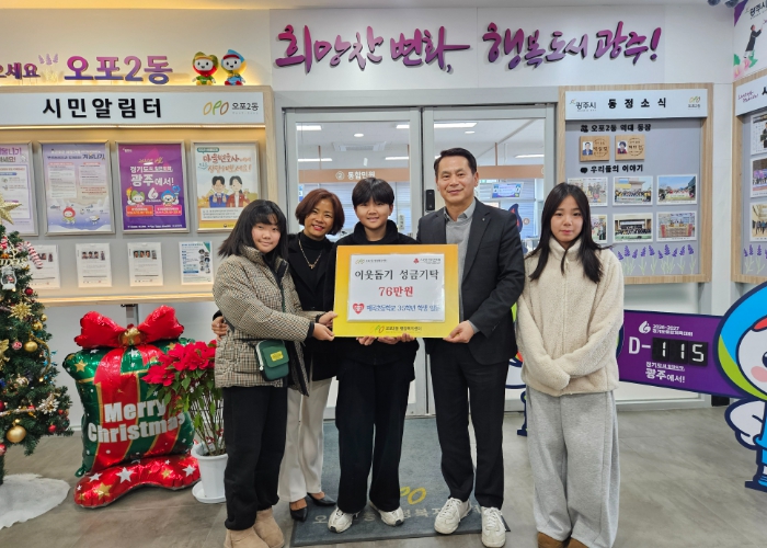 [뉴스노크=김인호 기자] 광주시 매곡초등학교 3학년과 5학년 학생들을 대표한 학생 대표 3명과 학부모회장, 지도교사는 22일 오포2동 행정복지센터를 방문해 바자회 수익금 전액 76만 원을 기탁했다.
