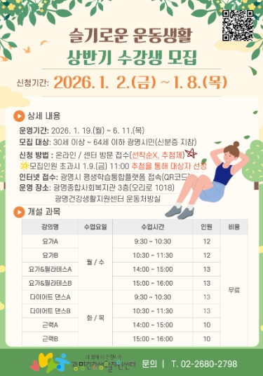 [뉴스노크=김인호 기자] 광명시 광명건강생활지원센터는 새해를 맞아 시민들의 건강한 생활습관 형성과 만성질환 예방을 위해 2026년 상반기 ‘슬기로운 운동생활’ 운동 프로그램 참여자를 모집한다.
