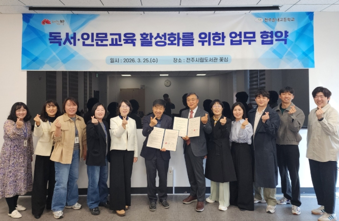 [뉴스노크=김인호 기자] 전주시 도서관평생학습본부는 25일 전주시립도서관 꽃심 강당에서 전주솔내고등학교와 ‘독서·인문교육 활성화를 위한 업무협약’을 체결했다.