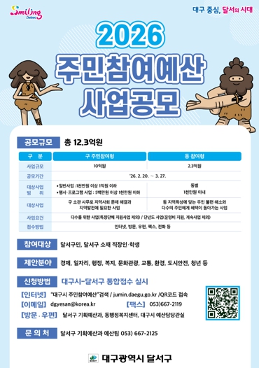 [뉴스노크=김인호 기자] 대구 달서구가 2월 20일부터 3월 27일까지 2027년도 예산 편성을 위한 주민참여예산 제안사업을 접수한다.