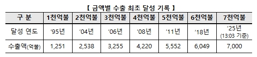 수출 7,000억 달러는 ‘18년도 6,000억 달러 달성 이후 7년만에 이뤄낸 쾌거로 전(全) 세계에서 6번째로 달성하며 수출강국 위상을 재확인했다. 특히, 6천억불은 7번째로 달성했으나, 7천억불은 6번째로 달성하며 우리 수출이 글로벌 주요국 대비 빠르게 성장하고 있음을 증명했다.