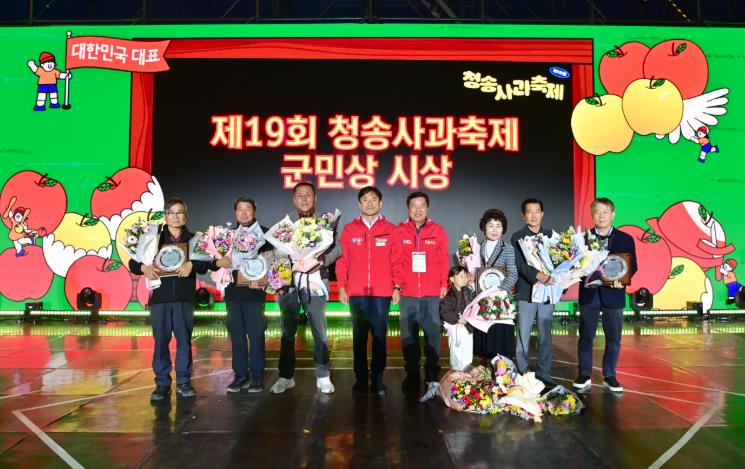 또한 축제 기간 중 열린 사과왕 시상식과 군민상 시상식이 축제의 의미를 한층 더했다. 사과왕 시상식에서는 ▲사과왕 조용태(안덕면) ▲우수상 김창율(부남면) ▲장려상 정무상(현서면) ▲황금진 도재범(안덕면) 씨가 수상의 영예를 안았으며, 군민상 시상식에서는 ▲임윤기(주산지리 이장) ▲권오영(신기2리 이장) ▲남법식(현동면체육회 부회장) ▲김영조(부남면 지역사회보장협의체 민간위원장) ▲권영선(바르게살기운동청송군협의회 회장) ▲권태욱(명성 TNS 전 대표) 씨가 수상했다.