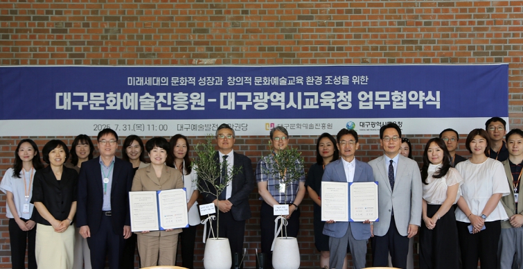 [뉴스노크=김인호 기자] (재)대구문화예술진흥원은 지난 7월 31일, 대구광역시교육청과 문화예술교육 활성화를 위한 업무협약을 체결하고, 영유아의 문화적 성장을 지원하고 현장 중심의 교육 환경을 조성하기 위한 협력 사업을 본격적으로 추진할 예정이다.