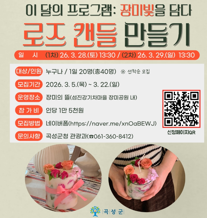 [뉴스노크=김인호 기자] 전남 곡성군은 ‘장밋빛을 담다’를 주제로 한 로즈캔들 만들기 체험 프로그램을 오는 3월 28일부터 29일까지 이틀간 운영한다고 밝혔다.