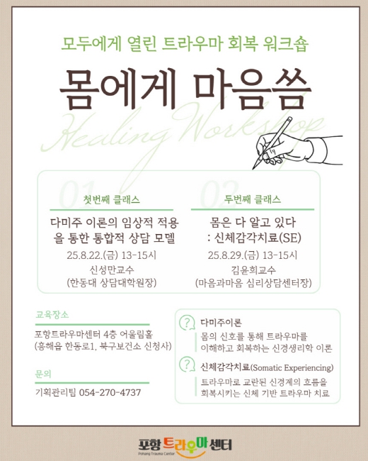 [뉴스노크=김인호 기자] 포항시 북구보건소 포항트라우마센터는 재난 상황에 대한 공동체 회복력을 높이기 위해 ‘트라우마 회복 워크숍-몸에게 마음씀’을 오는 22일과 29일 두 차례에 걸쳐 운영한다.