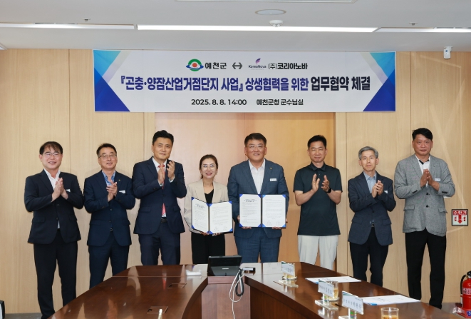 [뉴스노크=김인호 기자] 예천군은 8일, 군청에서 ㈜코리아노바(대표 남연지)와 곤충양잠 거점단지 사업 추진을 위한 업무협약(MOU)을 체결했다.