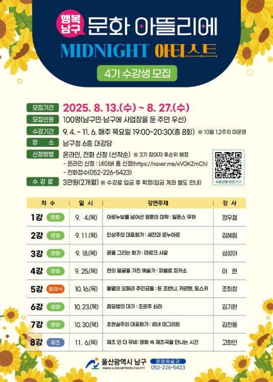 [뉴스노크=김인호 기자] 울산 남구는 문화예술 프로그램 ‘행복남구 문화 아뜰리에’ 4기 수강생을 13일부터 27일까지 모집한다고 밝혔다.