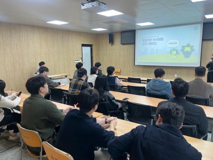 이날 교육은 한국환경산업기술원 연구원을 초빙해 녹색제품 구매제도 개요와 공사, 용역에서 녹색제품을 구매할 경우 구매 절차, 녹색제품 구매 시 유의사항에 대한 설명과 문답 순으로 진행됐다.