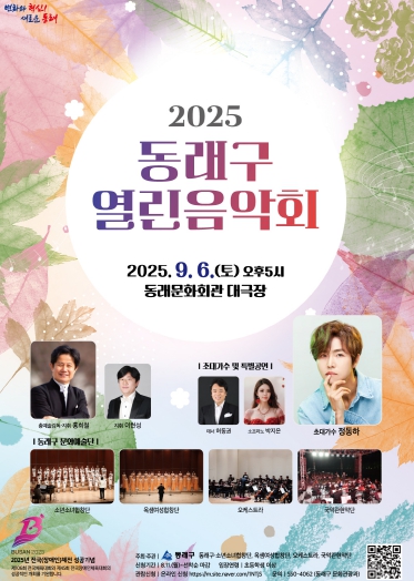 [뉴스노크=김인호 기자] 부산 동래구는 오는 9월 6일 오후 5시 동래문화회관 대극장에서 '2025 동래구 열린 음악회'를 개최한다고 밝혔다.