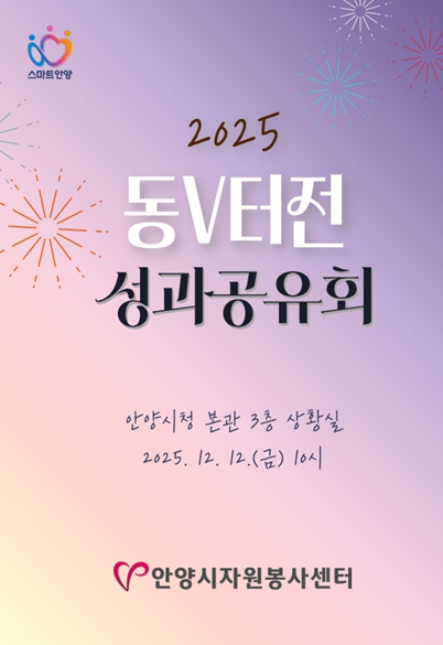 [뉴스노크=김인호 기자] 안양시자원봉사센터는 오는 12일 시청 본관 3층 상황실에서 자원봉사 거점센터 동V터전 코치 150여 명을 대상으로 ‘2025 동V터전 성과공유회’를 개최한다고 11일 밝혔다.