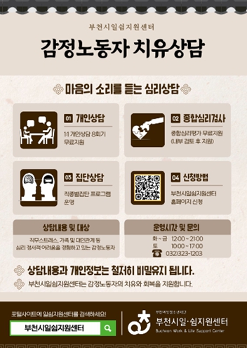 [뉴스노크=김인호 기자] 부천시여성청소년재단이 운영하는 부천시일쉼지원센터 치유상담실은 감정노동자에게 전문가 개인상담과 종합심리검사 등을 지원한다.