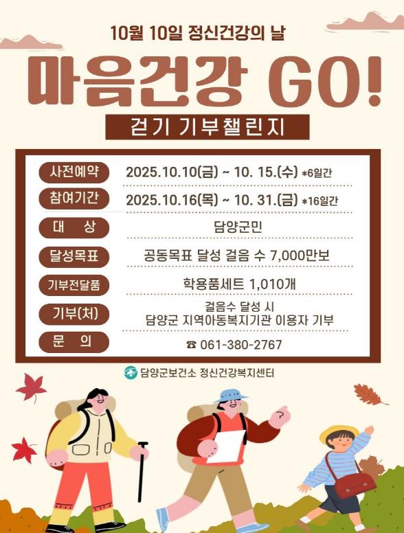 [뉴스노크=김인호 기자] 담양군은 10월 10일 ‘세계 정신건강의 날’을 맞이하여 전 군민을 대상으로 걷기 기부 챌린지를 운영한다고 밝혔다.