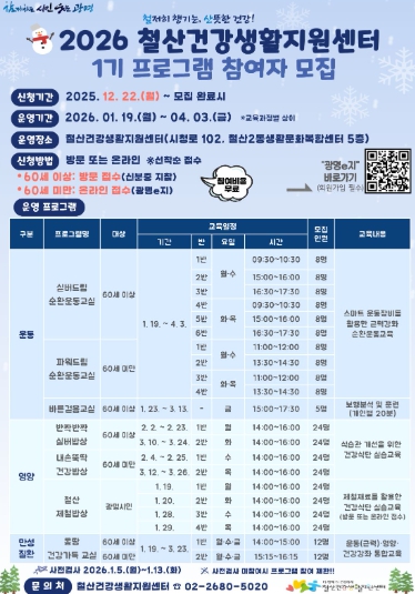 주요 프로그램은 ▲전자동 근력운동 장비(EGYM)를 활용한 개인 맞춤형 ‘튼튼드림 순환운동’ ▲건강한 식습관 형성을 위한 ‘철산영양가득교실’과 ‘철산제철밥상’ ▲조리실습·운동교육·건강강좌를 통합한 ‘몽땅 건강가득 교실’ 등이며, 내년 1월 19일부터 시작한다.