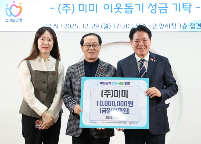 이날 시청 접견실에서 열린 성금 전달식에는 최대호 안양시장과 조인주 ㈜미미 회장, 조예서 전무 등이 참석했다.