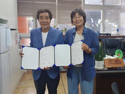 ▲ 왼쪽부터 사단법인 정용근 김해오광대보존회 부회장, 박미홍 김해구봉초등학교장 |