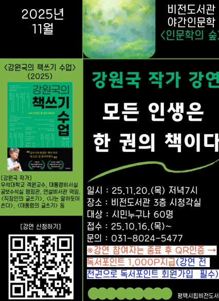 [뉴스노크=김인호 기자] 평택시 비전도서관은 오는 11월 20일 저녁 7시 '강원국의 책 쓰기 수업'의 강원국 작가를 초청하여 ‘모든 인생은 한 권의 책이다’를 주제로 야간 인문학 강연을 진행한다.